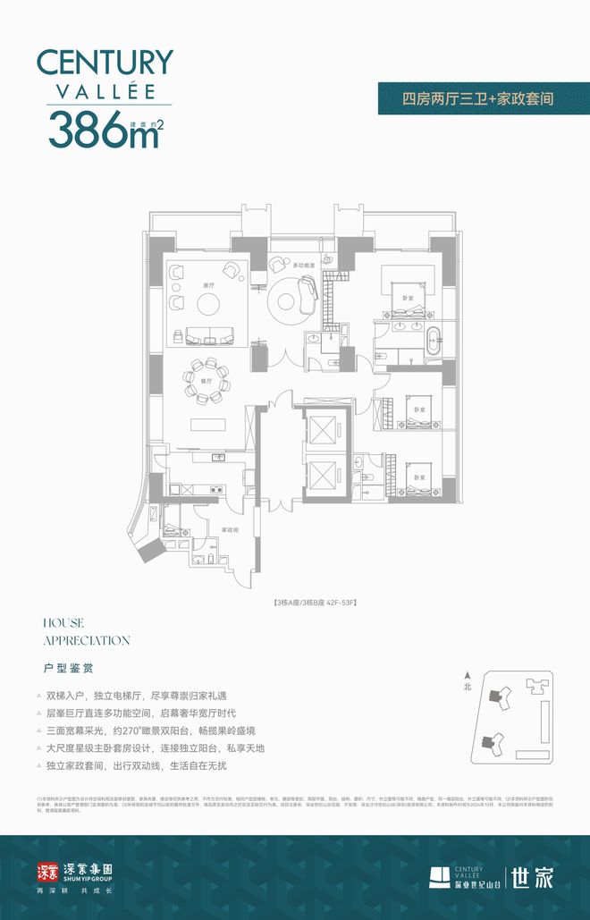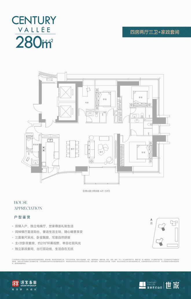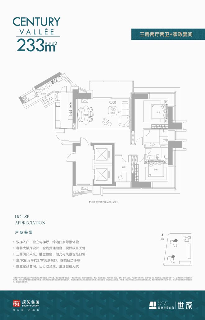 :约 131-262㎡2-5 房,70 年产权,户户带阳台;矩阵纵横设计,约 3.3m 奢阔层高,环幕景观阳台尽揽深湾风光;