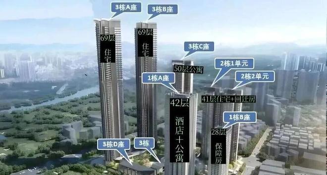 户型分布:总8栋(1A栋42层酒店+公寓、1B栋28层保障房,2栋1/2单元41层住宅,3A/3B栋69层住宅;3C栋50层公寓、3D栋4层公寓)